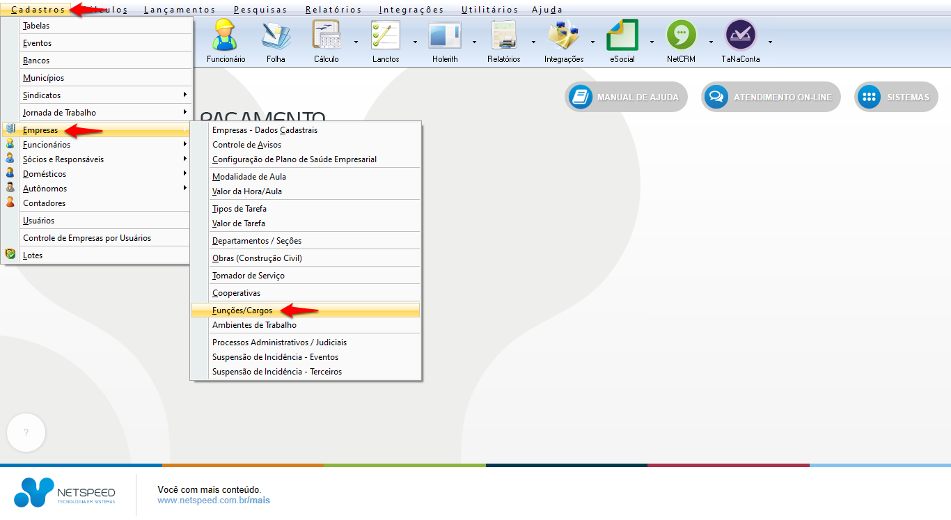 - Acesse o menu Cadastros, opção Empresas, item Funções/Cargos.