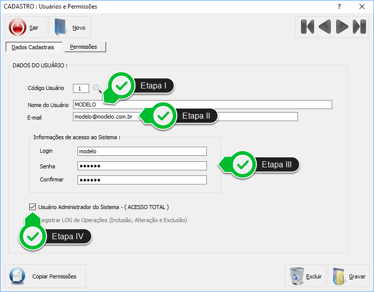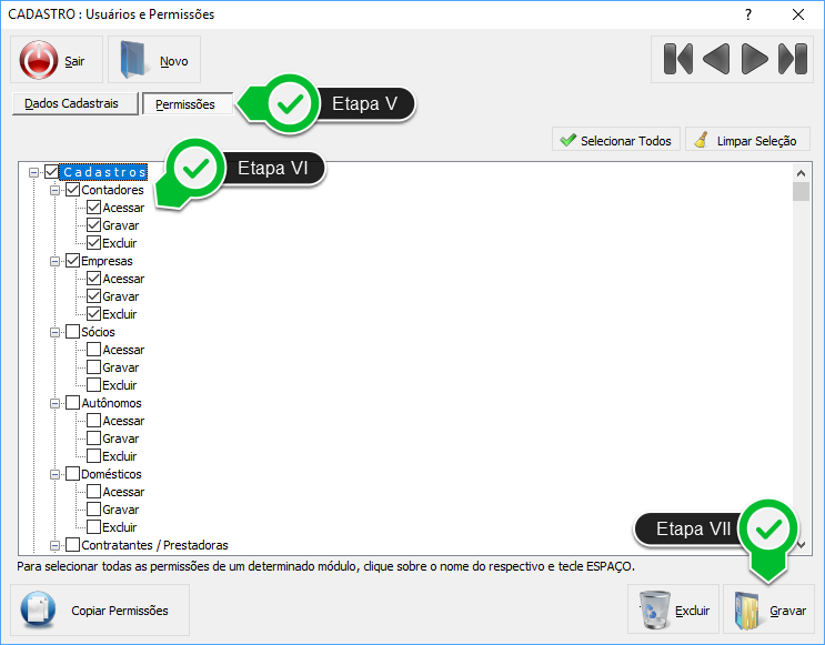 Etapa VI - Marque somente os módulos que o Usuário terá acesso e, para cada módulo selecionado, informe se ele poderá Acessar, Gravar e/ou Excluir, marcando as respectivas permissões.