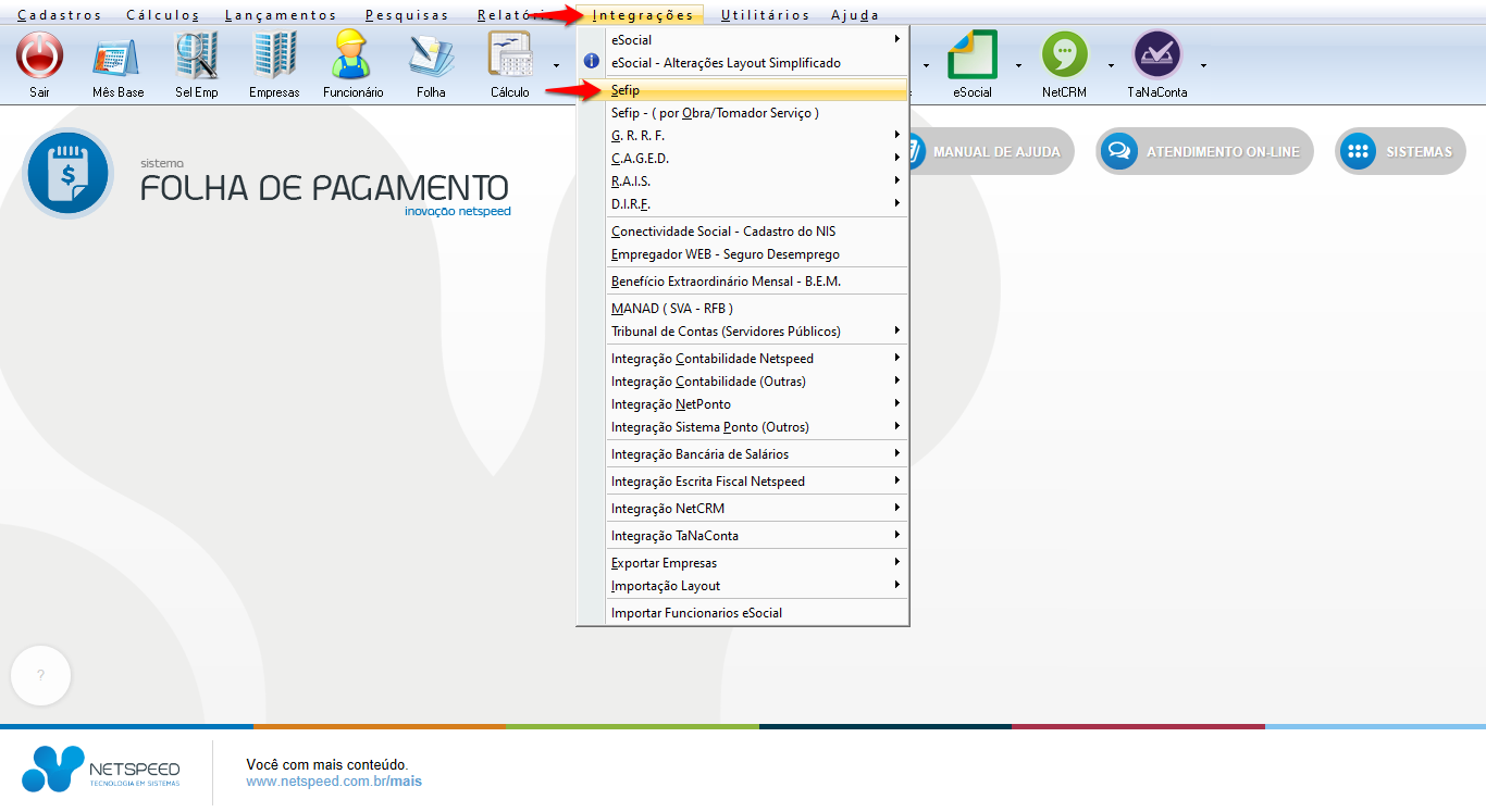 - Acesse o menu Integrações, opção Sefip.
