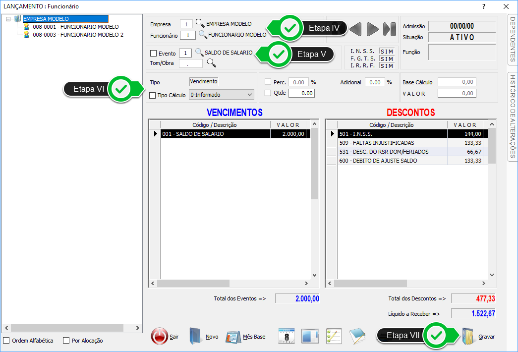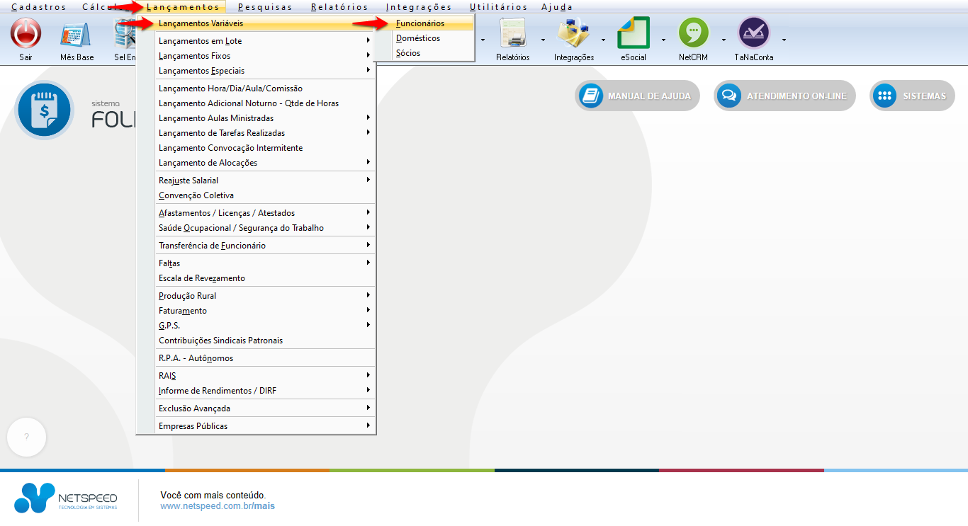 - Acesse o menu Lançamentos, opção Lançamentos Variáveis, item Funcionários.