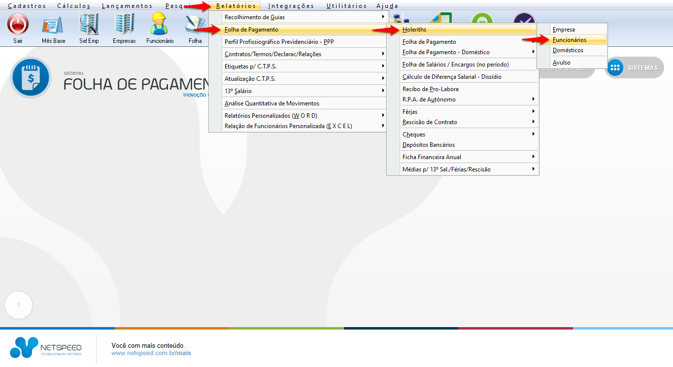 - Acesse o menu Relatórios, opção Folha de Pagamento, item Holeriths, subitem Funcionários.