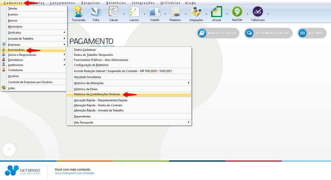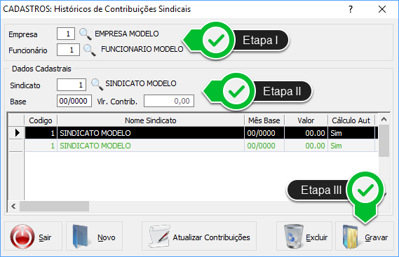 - Acesse o menu Cadastros, opção Funcionários, item Contribuições Sindicais.