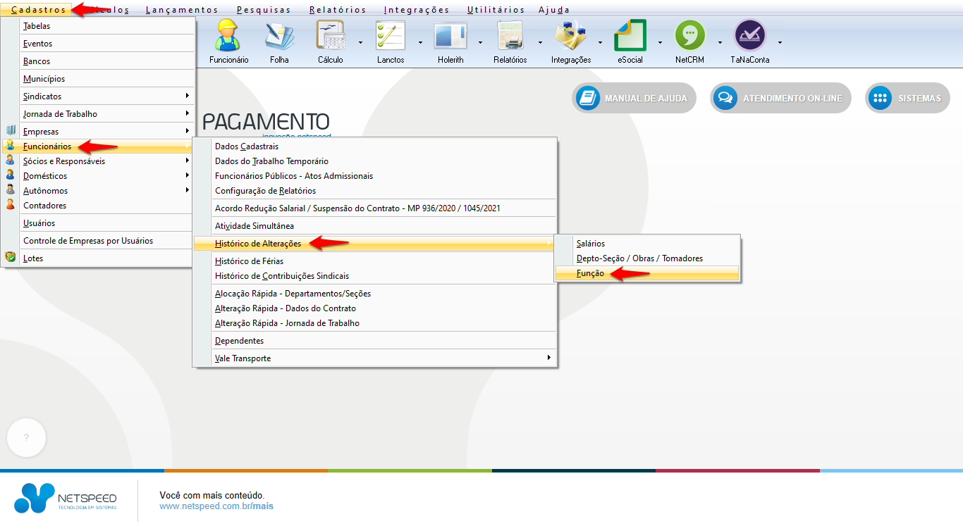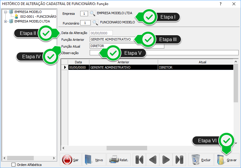 - Acesse o menu Cadastros, opção Funcionários, item Histórico de Alterações, subitem Função.