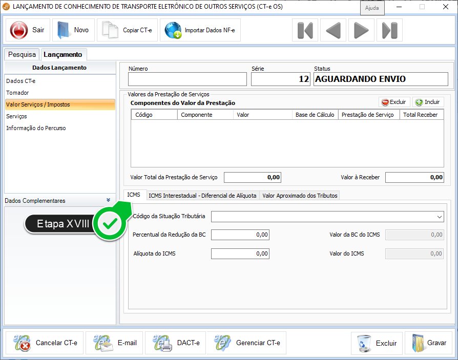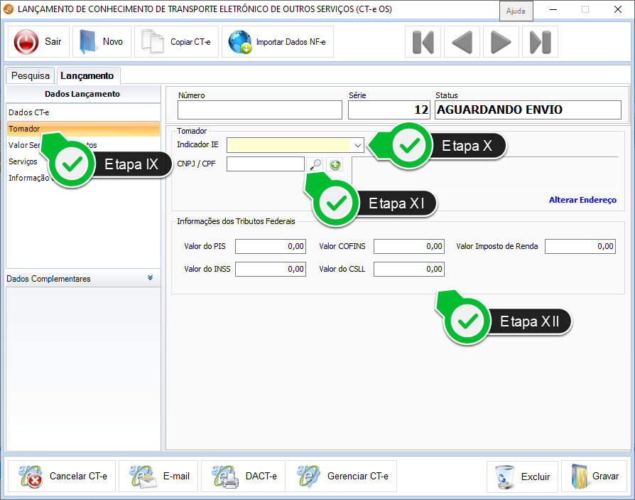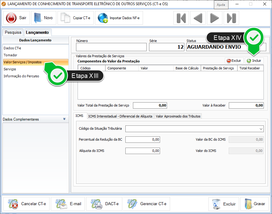 Etapa XIII - Clique sobre a subaba Valor Serviços / Impostos.