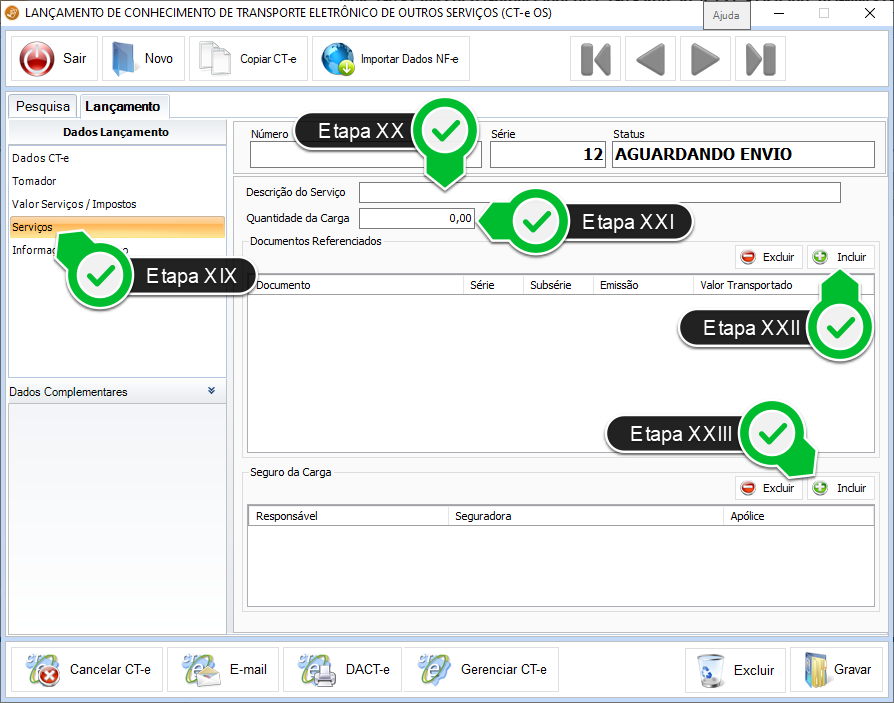 Etapa XXIII - Clique sobre esta opção para Incluir os dados do Seguro de Carga.
