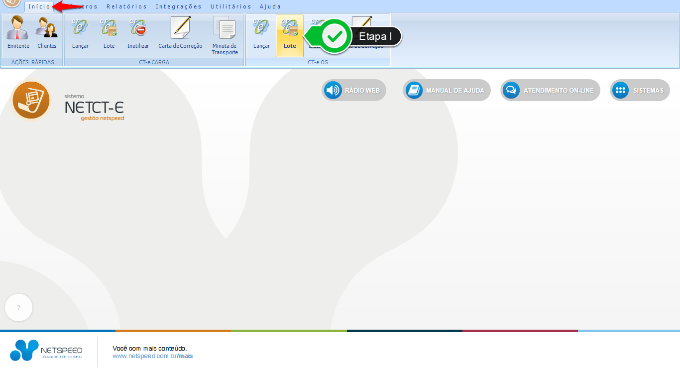 Etapa I - Clique sobre a opção Lote, no grupo CT-e OS.