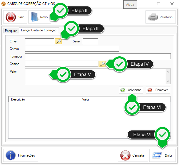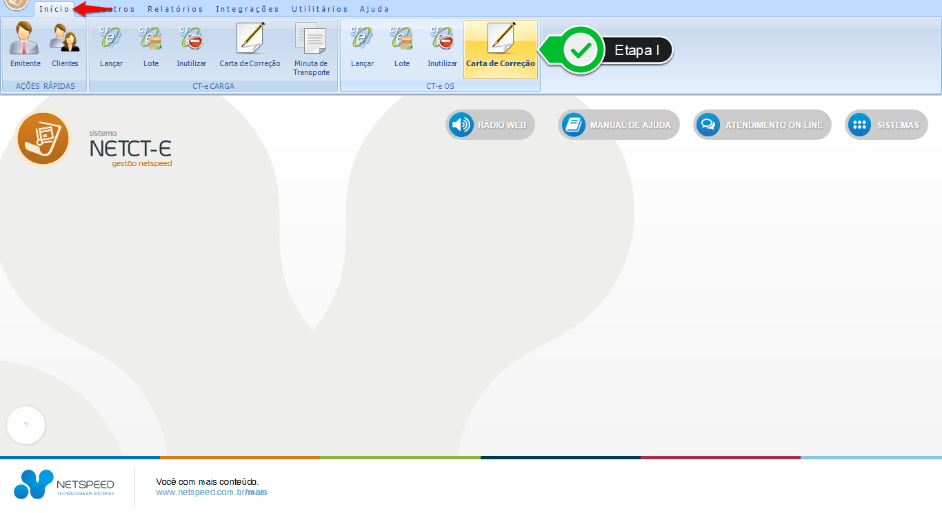 Etapa I - Clique sobre a opção Carta de Correção, no grupo CT-e OS.
