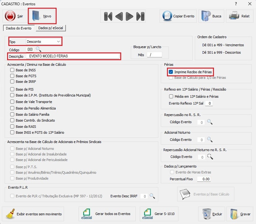 Etapa IX - Informe o evento criado para desconto nas férias no campo Evento.
