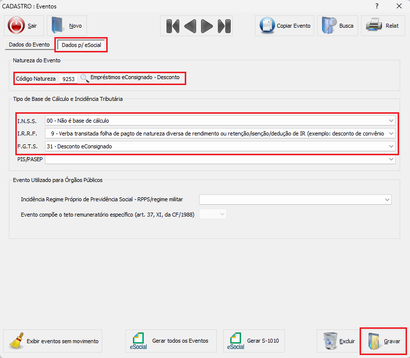 Atenção! O evento precisa ser cadastrado exatamente como determinado no Manual do eSocial, página 106, item 20.1: A informação de desconto referente a parcela do eConsignado deve ser feita mediante utilização de rubrica com natureza [9253]. Os campos {codIncFGTS}, {codIncCP} e {codIncIRRF} devem ser preenchidos com [31], [00] e [9], respectivamente.