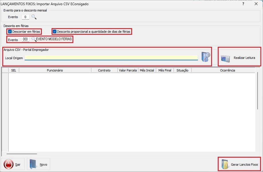 - Ao selecionar tal opção, o sistema abrirá a tela Lançamentos Fixos: Importar Arquivo CSV eConsignado.
