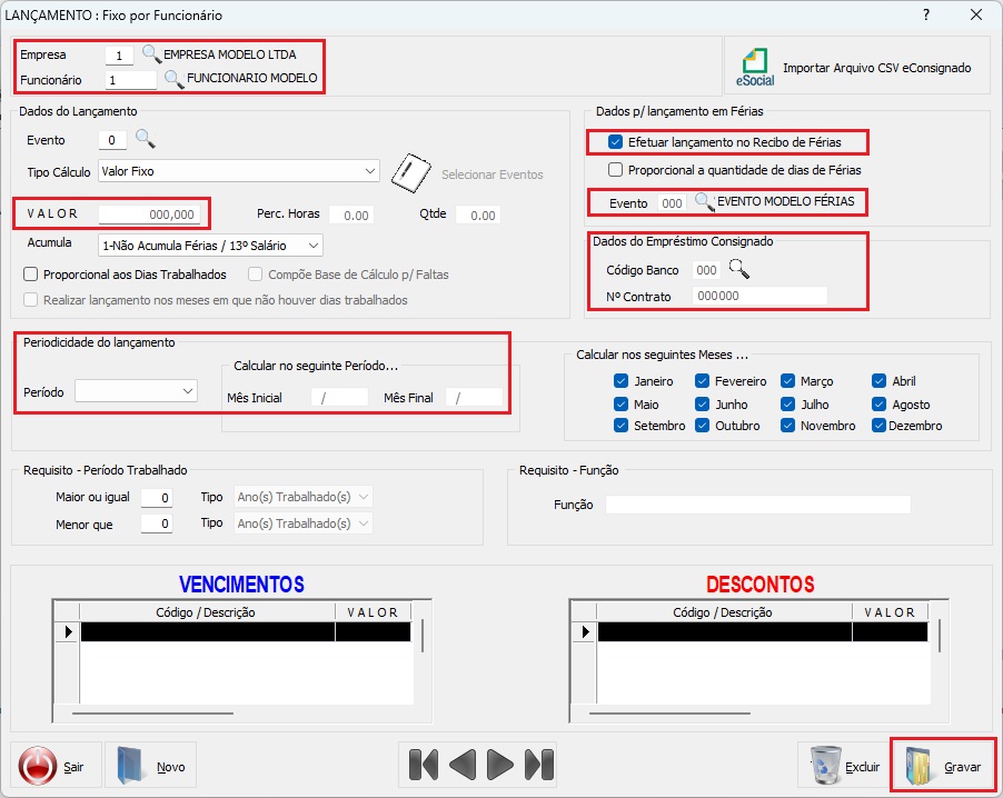 - Também é possível realizar manualmente o lançamento do empréstimo consignado para o recibo de férias, acessando Lançamentos, Lançamentos Fixos, Funcionários.