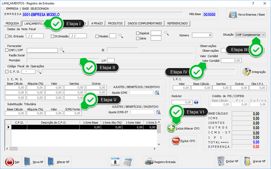 Etapa IX - Neste quadro, informe o C.F.O., preencha o campo quantidade e mantenha o Valor Total zerado.