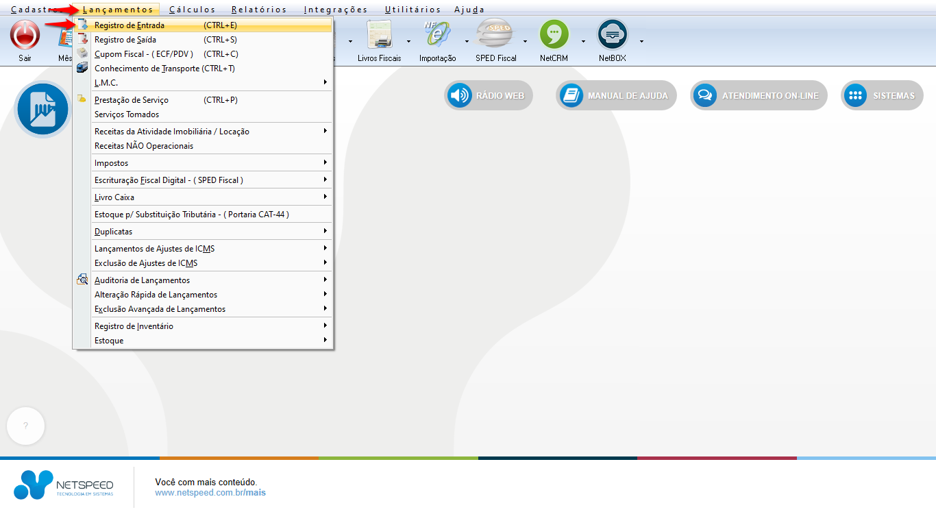 - Acesse o menu Lançamentos, opção Registro de Entrada.
