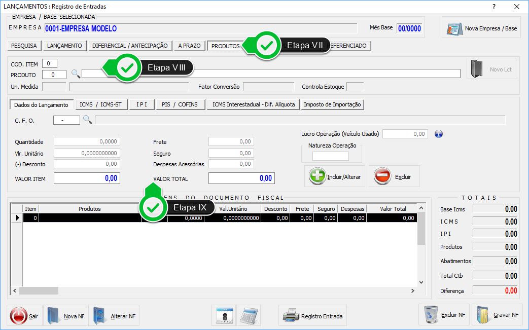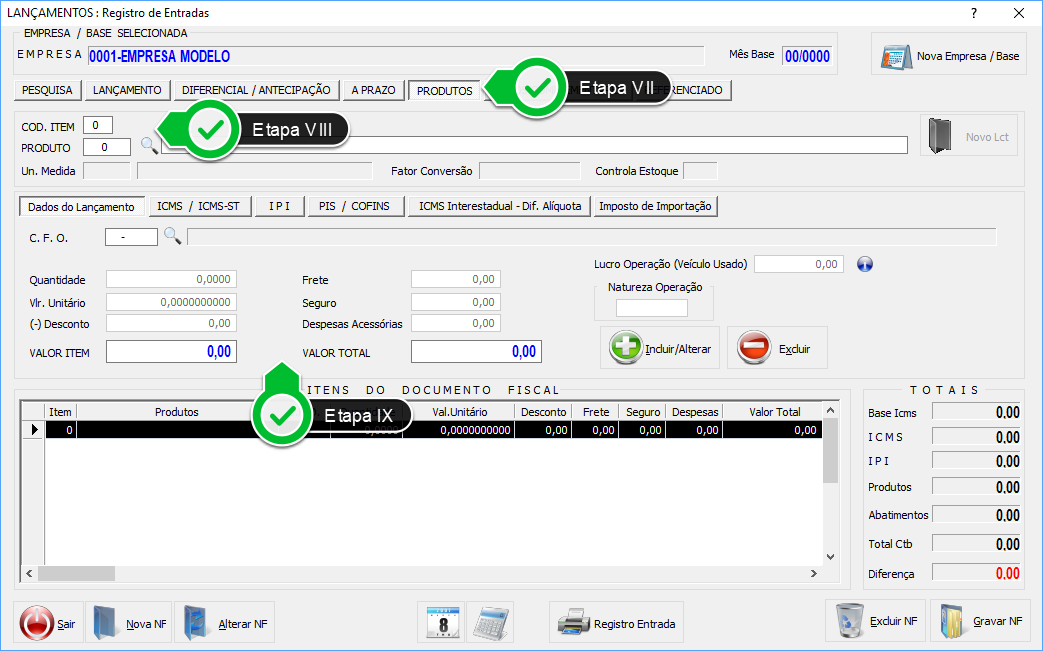 Etapa IX - Neste quadro, informe o C.F.O., preencha o campo Quantidade e mantenha o Valor Total zerado.