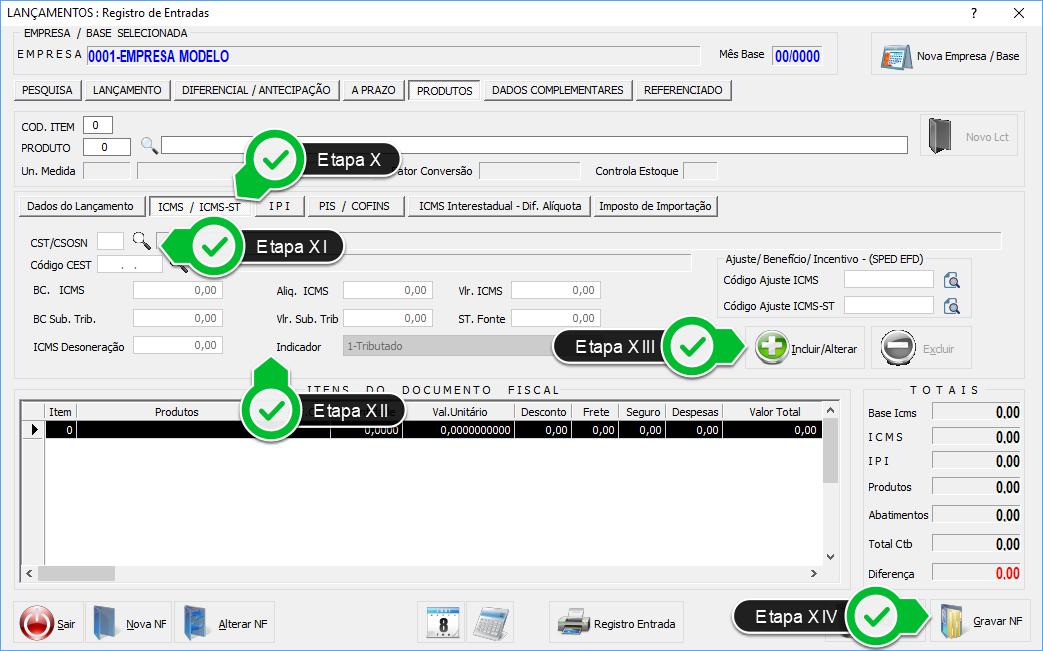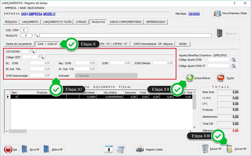 Etapa XI - Neste quadro, inclua o CST tributado, mantenha a Base de Cálculo zerada e preencha somente Alíquota e o valor do ICMS.