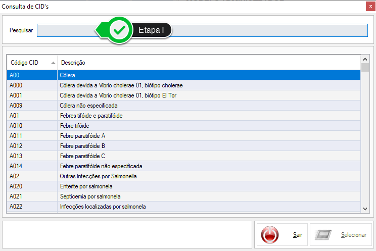 Acesse o menu Cadastros, opção CID''s. Será exibido o módulo que lhe permitirá realizar as pesquisas necessárias. Etapa I - Utilize este campo para pesquisar os CID''s.
