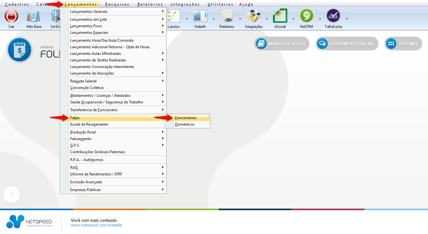 - Acesse o menu Lançamentos, opção Faltas, item Funcionários.