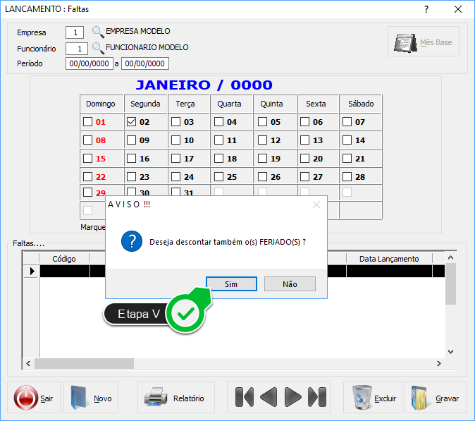 Etapa V - Se houver algum feriado no mês em questão, será exibida essa mensagem. Clique em Sim para descontar também o(s) Feriado(s).