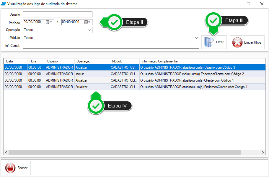 Etapa IV - Visualize, neste quadro, todas as ações realizadas no sistema, de acordo com os filtros utilizados.