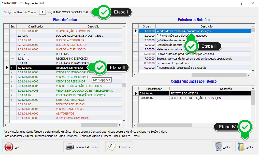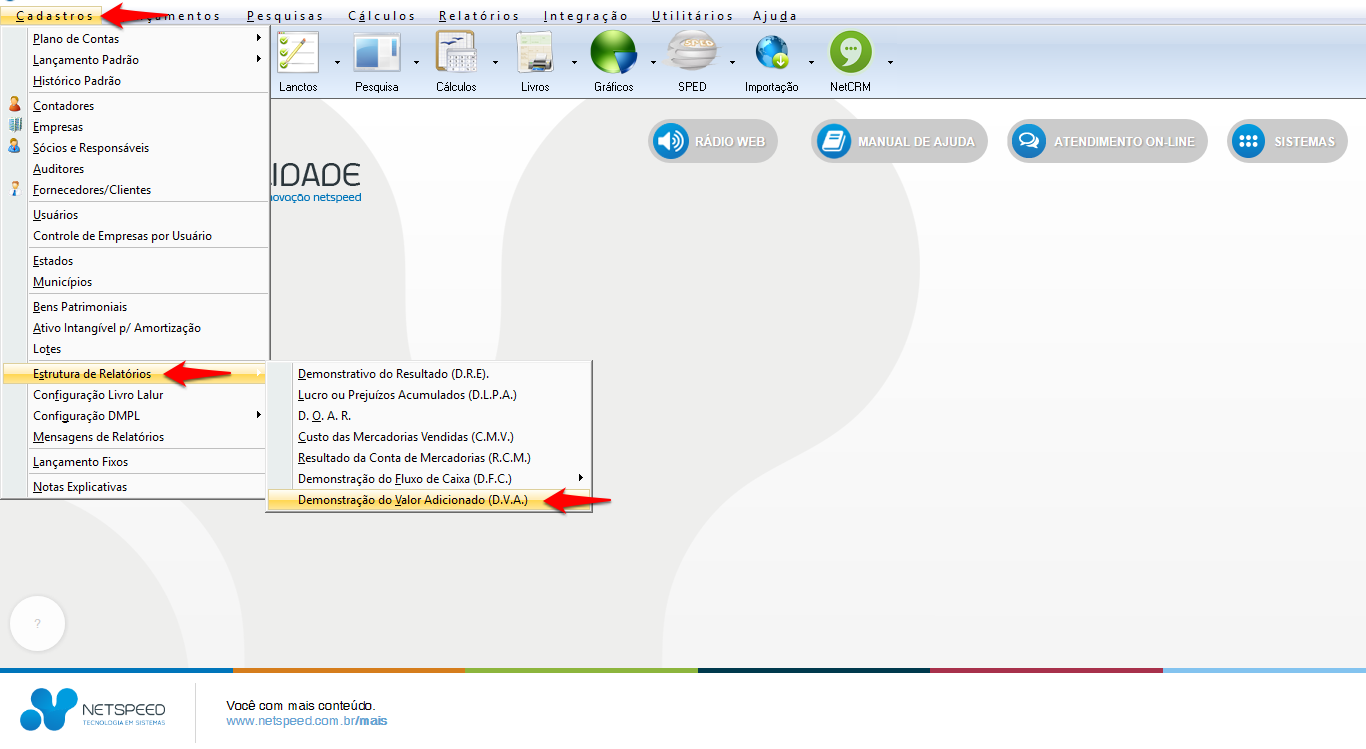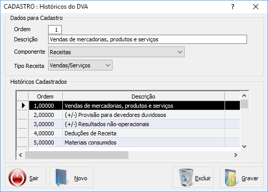 - Acesse o menu Cadastros, opção Estrutura de Relatórios, item Demonstração do Valor Adicionado (D.V.A.).