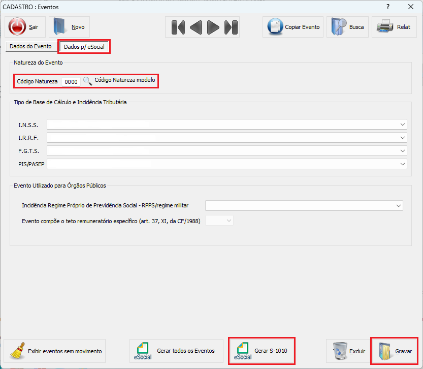 Etapa I - Na aba Dados p/ eSocial, confira o valor do campo Código da Natureza, faça o ajuste necessário e clique em Gravar.