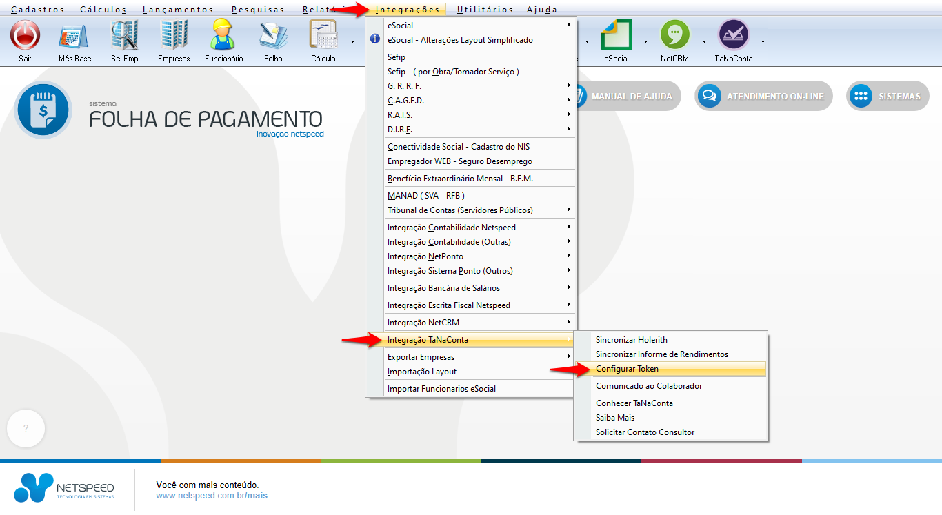 - Acesse o menu Integrações, opção Integração TaNaConta, item Configurar Token.