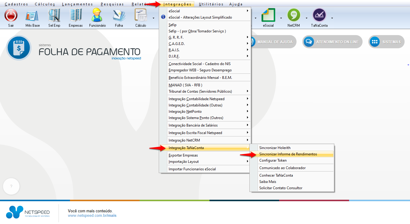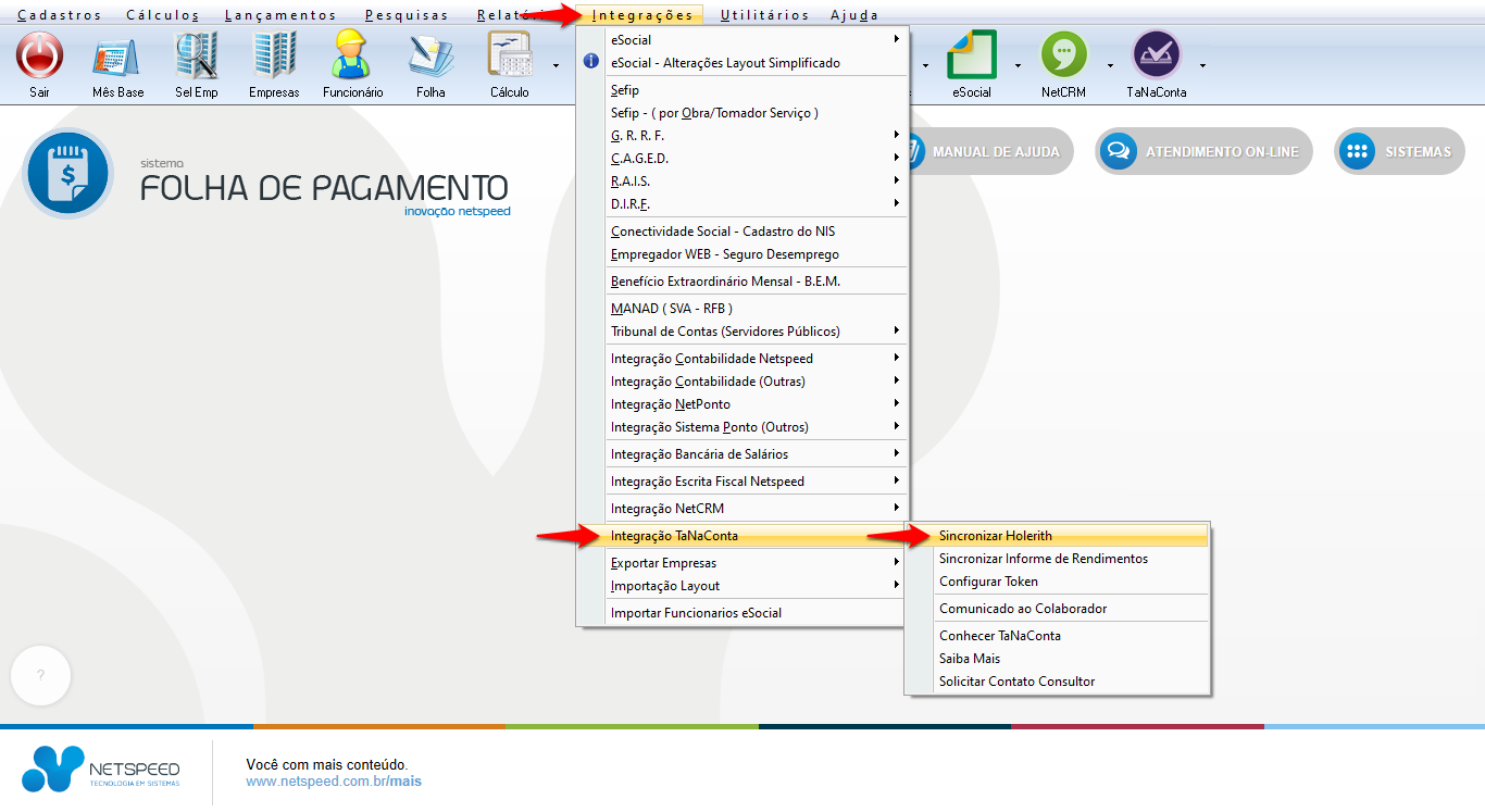 - Acesse o menu Integrações, opção Integração TaNaConta, item Sincronizar Holerite.