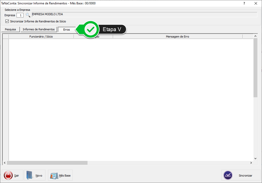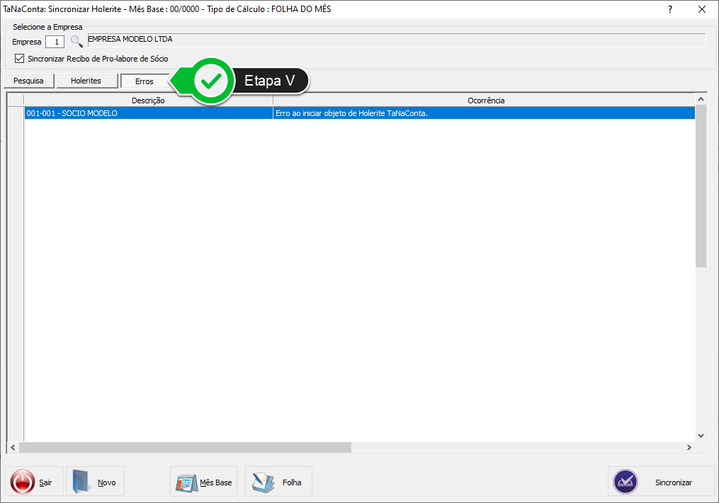 Etapa V - Caso ocorra algum erro na sincronização, este aparecerá nesta aba. Clique nela para visualizá-lo.