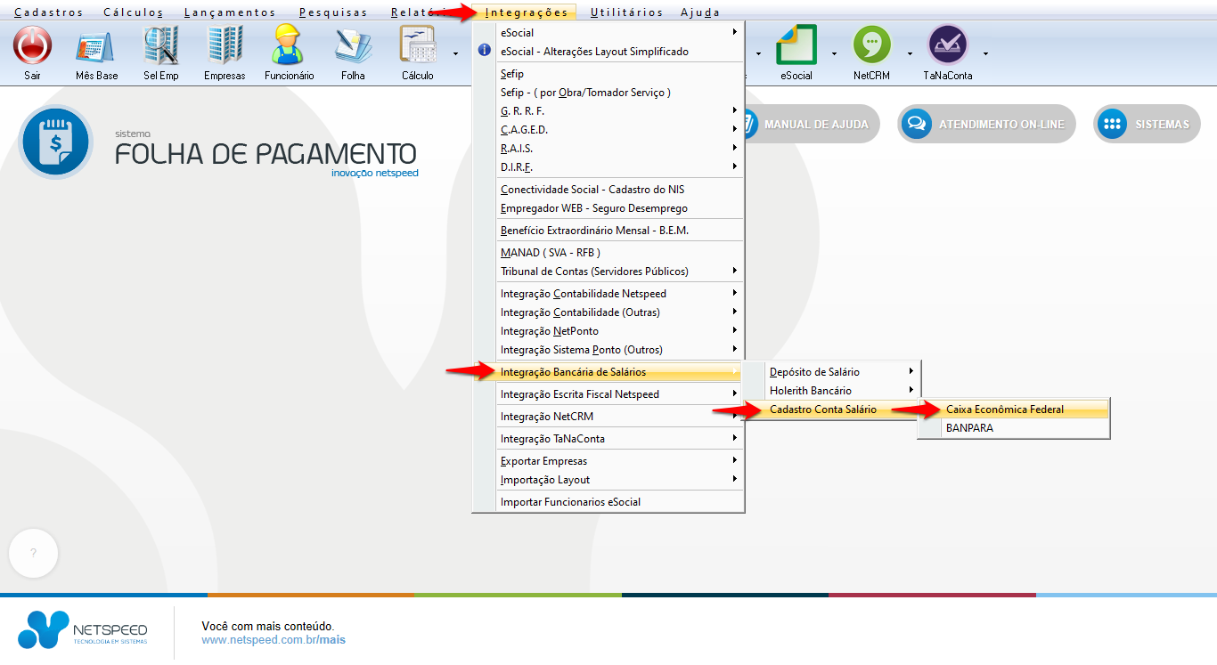 - Acesse o menu Integrações, opção Integração Bancária de Salários, item Cadastro Conta Salário, subitem Caixa Econômica Federal.