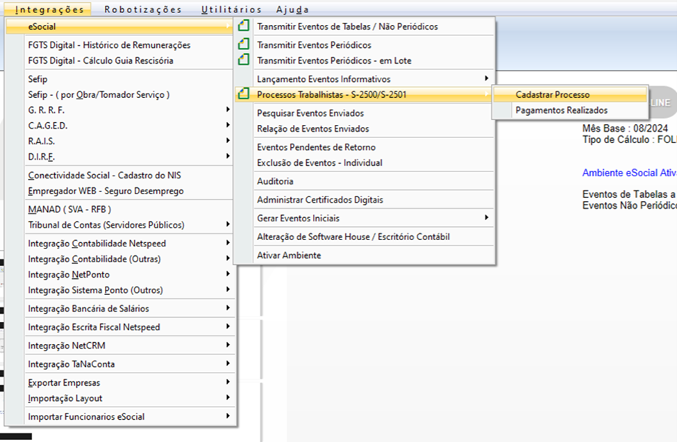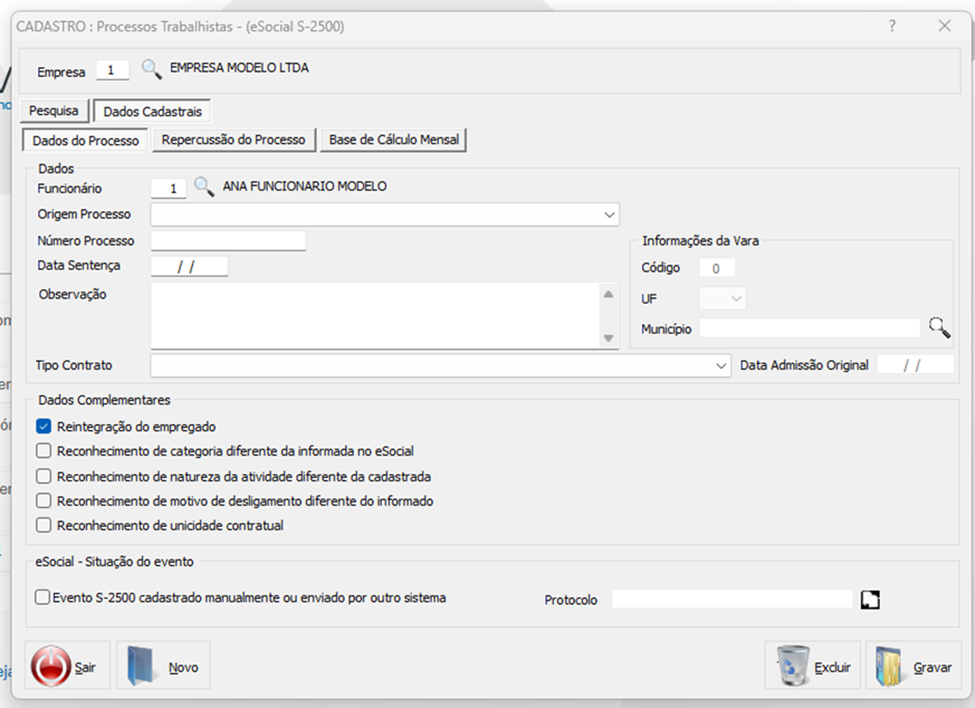 Acesse o menu: Integrações | eSocial | Processos Trabalhistas S-2500/S-2501 | Cadastrar Processo.
