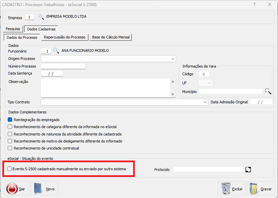 Nota: Caso o processo tenha sido cadastrado manualmente no eSocial ou por outro sistema anteriormente, marque a opção "Evento S-2500 cadastrado manualmente ou enviado por outro sistema" e informe o número do protocolo correspondente.