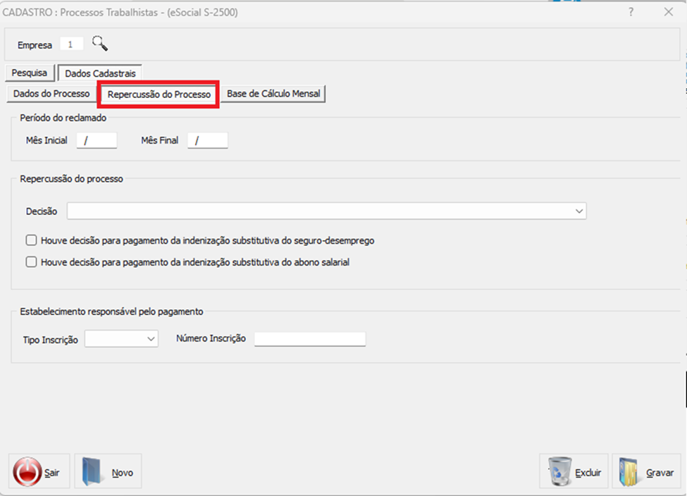 Após preencher os dados iniciais, acesse a aba Repercussão do Processo: