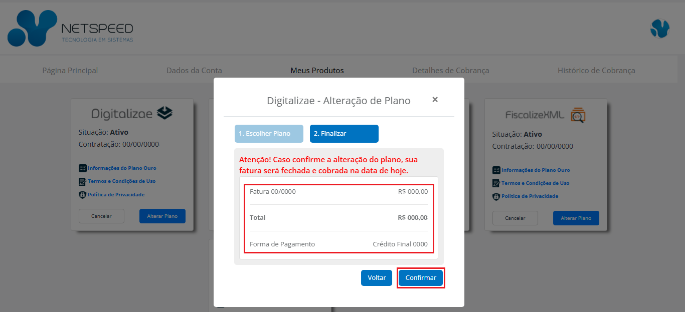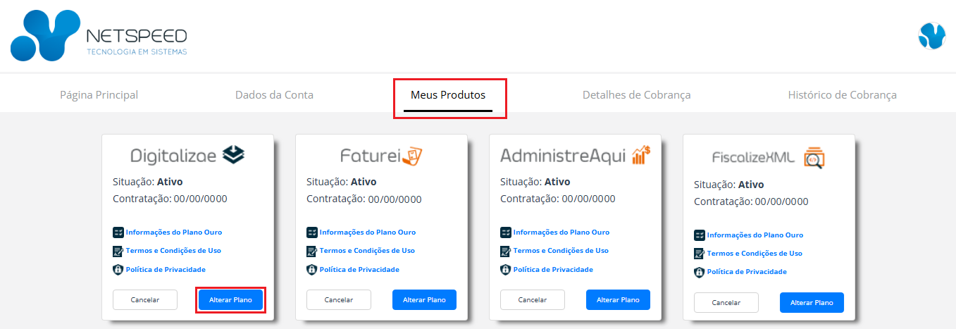 - Ao final, o acesso será direcionado para a página Meus Produtos, na qual será possível verificar os detalhes do novo plano contratado, clicando em Informações do Plano.
