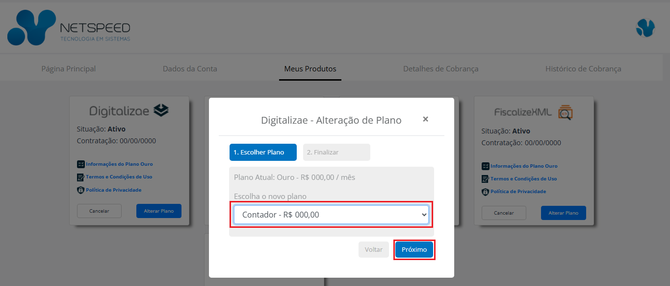 Etapa II - Na nova janela, clique na seta para escolher o novo plano e clique em Próximo.