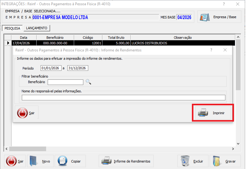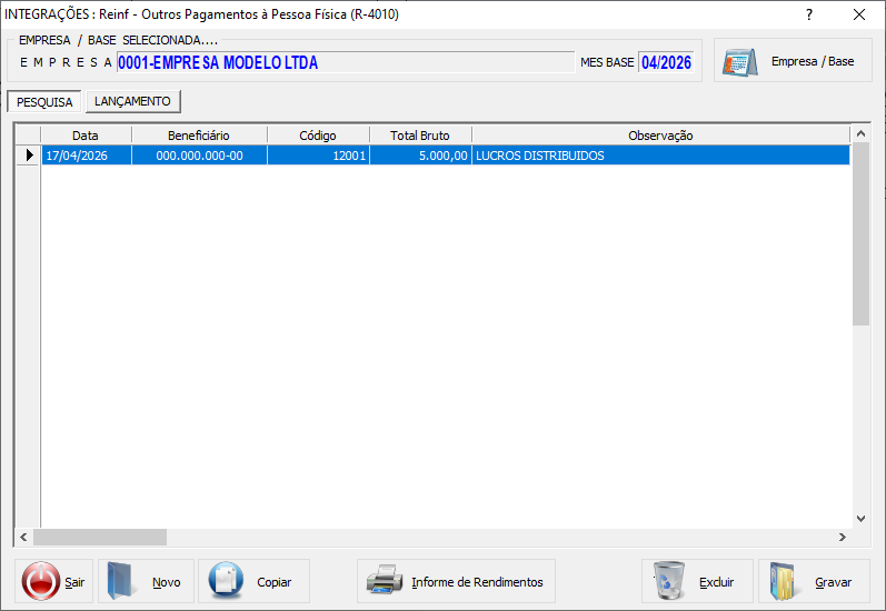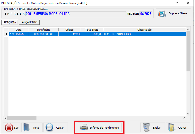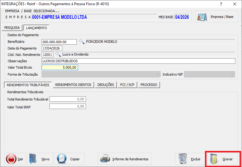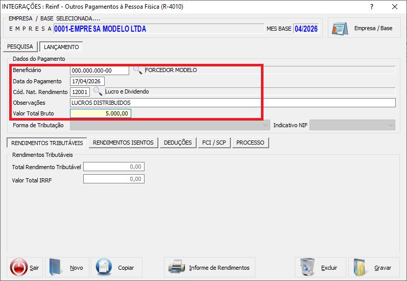 • Para a Natureza 12001 (Lucros com base contábil), o valor deve ser preenchido diretamente no campo Valor Total Bruto, mantendo os campos de rendimentos tributáveis e IRRF zerados (até 12/2025).