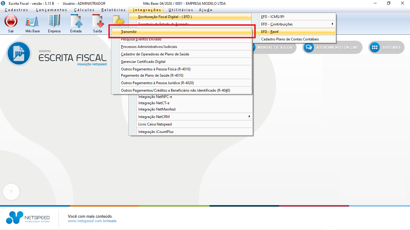 10. Transmissão: Após o lançamento e conferência (via Informe de Rendimentos), acesse a tela de transmissão da Reinf para enviar os eventos ao governo.
