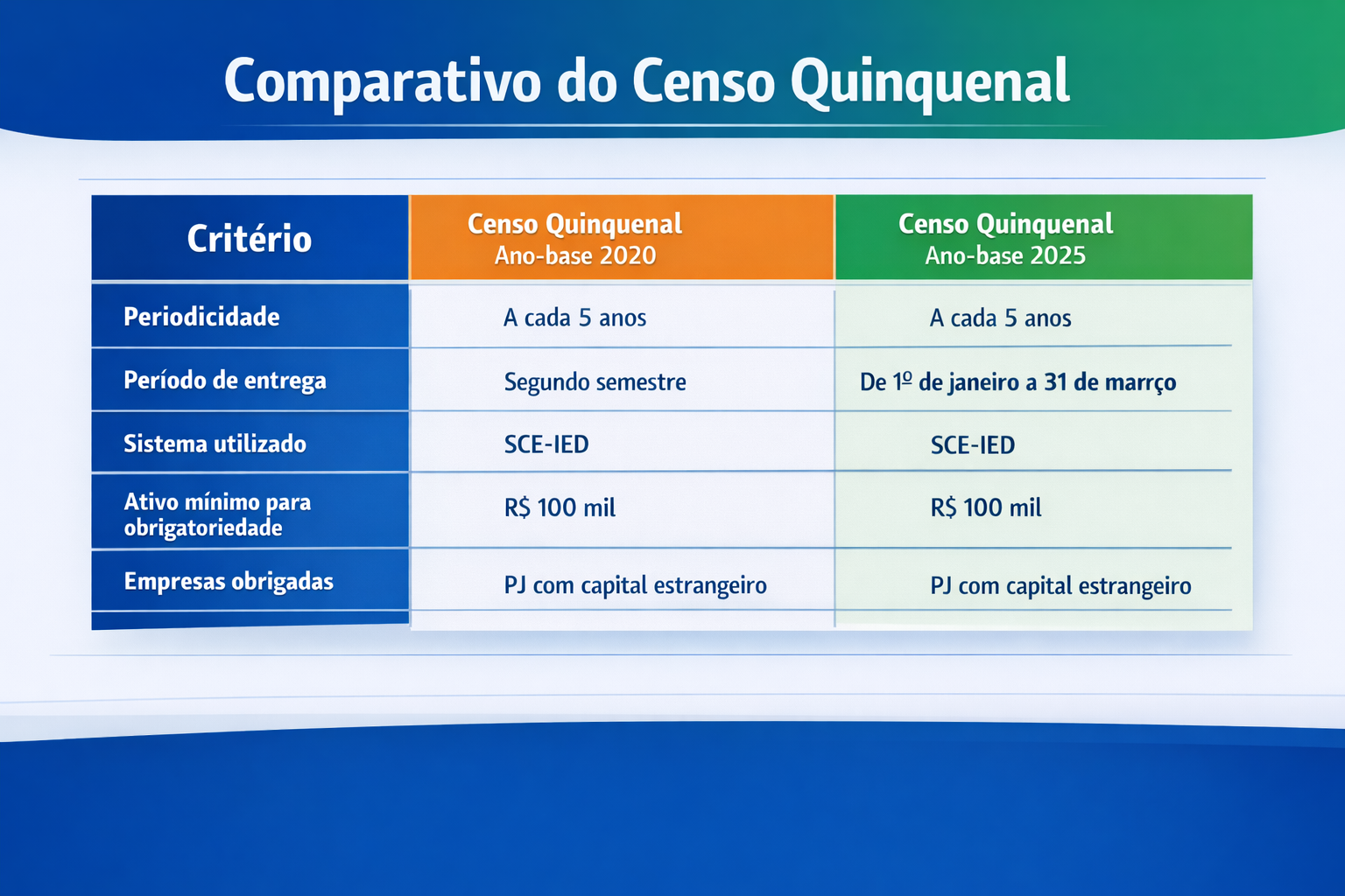 Empresas brasileiras com participação de capital estrangeiro precisam ficar atentas ao novo prazo da Declaração Quinquenal do Censo de Capitais Estrangeiros no País. A obrigação, que antes era cumprida no segundo semestre, passou a ter período declaratório entre 1º de janeiro e 31 de março.