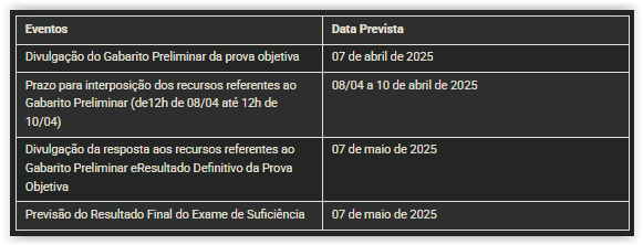 O gabarito preliminar da prova objetiva será divulgado amanhã, segunda-feira, dia 07 de abril de 2025. Confira abaixo as próximas etapas da prova: