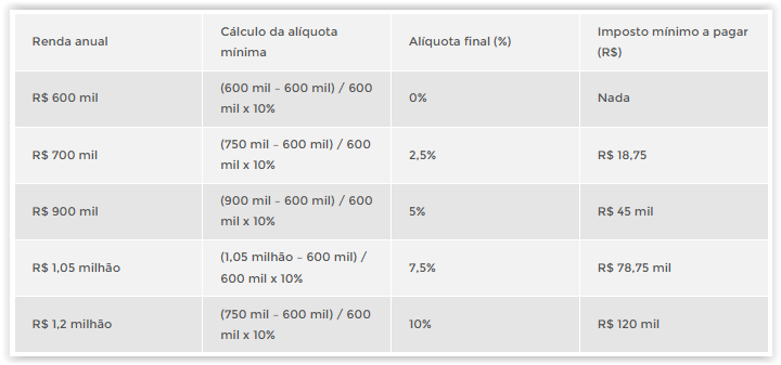 Após todas as deduções feitas, o imposto mínimo a pagar será calculado com base numa fórmula matemática que deduz o valor mínimo de R$ 600 mil por ano e aplica uma alíquota gradual.