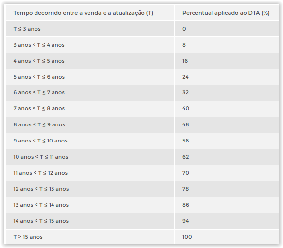 - Os percentuais proporcionais ao tempo decorrido da atualização até a venda são os expostos na tabela abaixo.