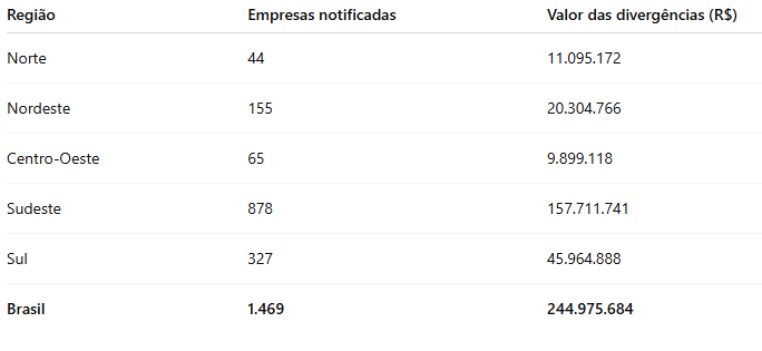 Os dados desta edição apontam maior concentração de contribuintes notificados na região Sudeste, que reúne quase 60% das empresas e mais de 64% do valor total das divergências. Confira a distribuição por região: