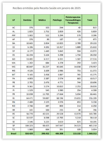 No primeiro mês em que o uso do Receita Saúde passou a ser obrigatório, foram emitidos 1.368.312 recibos, cumprindo seu objetivo de digitalizar as informações dos pagamentos realizados e de simplificar o processo de emissão de recibo de despesa com saúde por profissionais pessoas físicas (médicos, dentistas, psicólogos, fisioterapeutas, fonoaudiólogos, terapeutas ocupacionais). Os três primeiros profissionais foram responsáveis por mais de 90% dos recibos emitidos, conforme detalhamento abaixo.